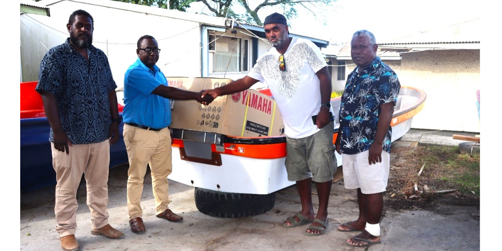 Photo caption: Dr Gregory Jilini DSHC and Mr Layten Jacob DSC handed over the Yamaha engine and boat to Dr Zorik Olangi, MS Atoifi Hospital and Mr Timothy Ramo, Atoifi Hospital staff