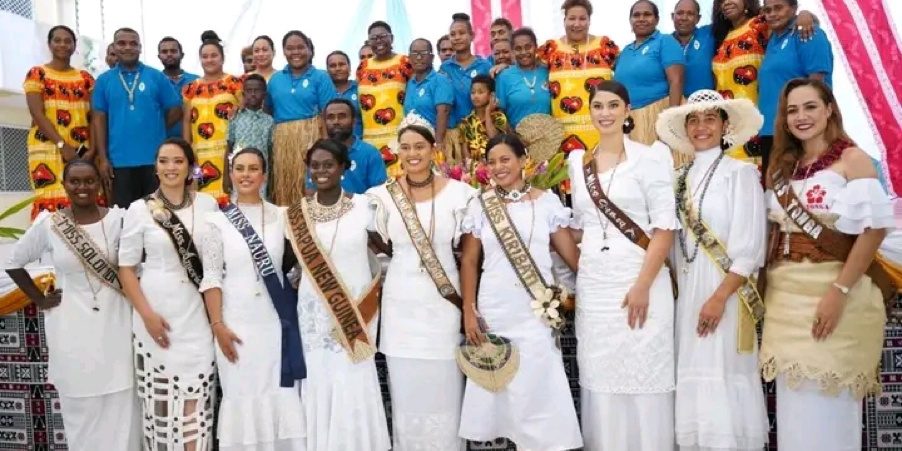 Photo caption: The eight Miss Pacific Islands Pageant 2025 contestants with the reigning Miss Pacific Islands, Moemoana Schwenke (centre)and members of the ACOM Saint Barnabas Cathedral congregation on Sunday.
