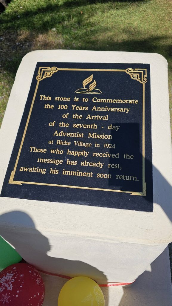 The writings on the monument reads; “This stone is to commemorate the 100 years anniversary of the arrival of the Seventh Day Adventist Mission at Biche Village in 1924. Those who happily received the message has already rest, awaiting His imminent soon return.”
