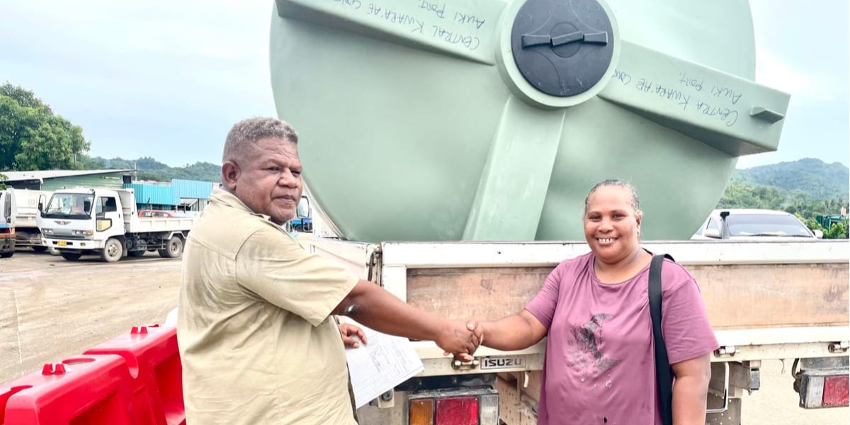 Photo caption: Representative of Kilusakwalo Adailiua Zone, Joy Oti, right, receives a water thank from CKC project officer Sam Ilimanu in Auki. Photo by David Wairimalefo.