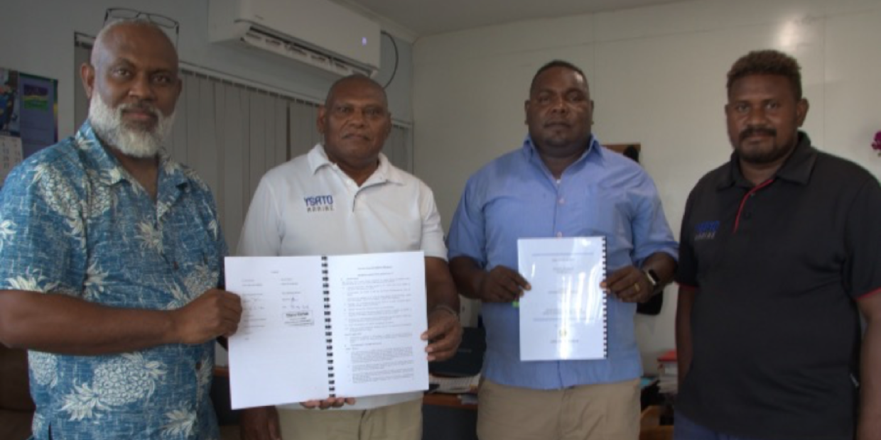 MAIN PHOTO CAPTION: Permanent Secretary of MRD, John Niroa Misite’e, and MRD Deputy Secretary Technical (Supervising), George Balairamo, third from left together with senior representatives from Y-Sato Marine company during a signing ceremony at the MRD.