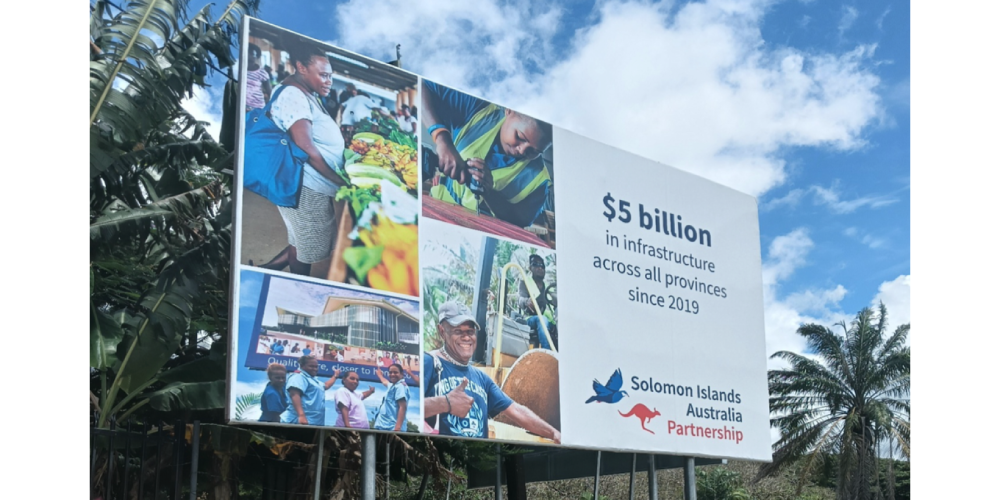 Its latest billboard claims it has created 27, 300 jobs in the same period. Australia is also using the airwaves to spread its propaganda, using Solomon Islanders to say he or she works in these projects.