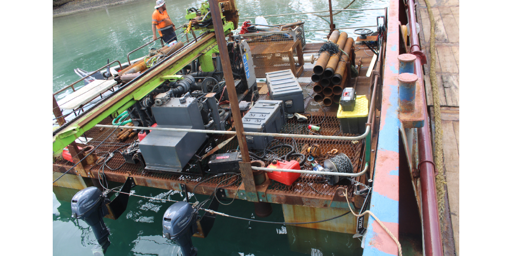 Also, on site was local shipping and logistic company Silent World, which delivered and assembled the 6 x 6 metre metal barge from which the engineers operated the drill and collected samples.