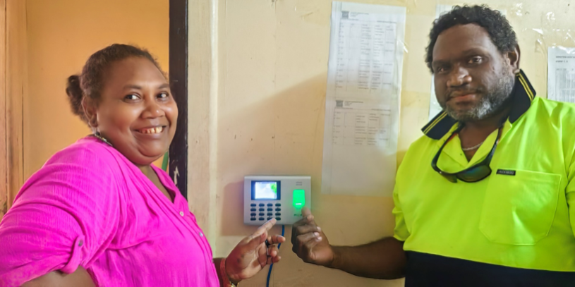 Panatina CHS Principal Mary Ihasimae and Managing Director of Smart Technology Ltd, Rolex Sitana with the new electronic device to monitor teachers. Photo supplied
