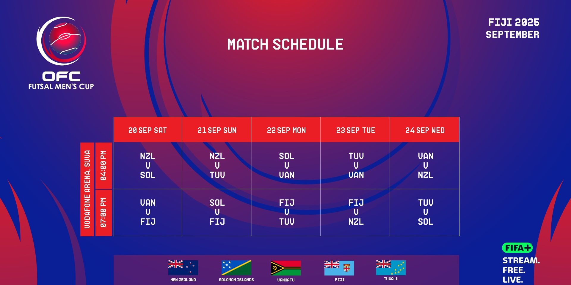 New Zealand, Oceania’s representatives at last year’s FIFA Futsal World Cup in Uzbekistan, will be joined in the round-robin format by hosts Fiji, Vanuatu, Solomon Islands, and Tuvalu. The tournament winner will be decided on total points accumulated, with goal difference and then goals scored serving as tiebreakers if required.