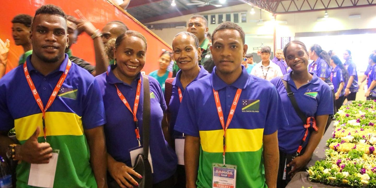 The Solomon Islands Weightlifting Team, led by Coach Wendy Hale, includes athletes Jenly Wini Tegu, Shimara Tegu, Guy Saeg and Freeman Hale Aumalefo.