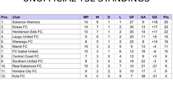 KOSSA sits on the second place with 22 points and Waneagu United on fifth place with 16 points.