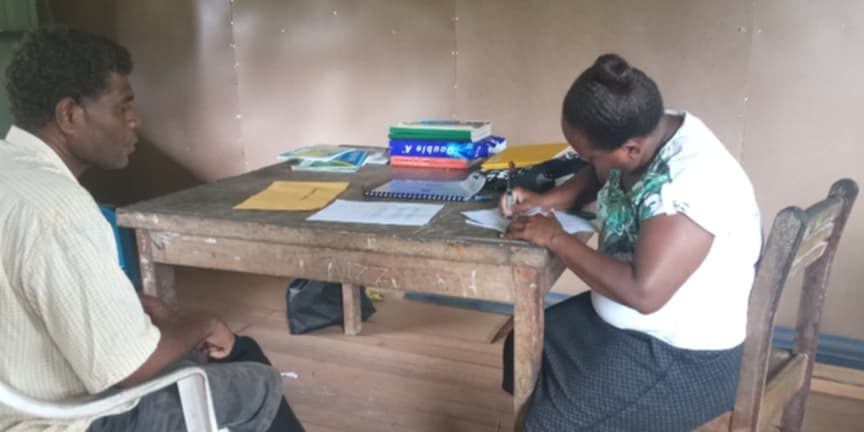 Photo caption: Trinity Community High school Deputy Principal Christina Kuti signs reciept as West Kwara’ae constituency Development Officer looks on.