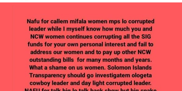 The MP simply let go, accusing women leaders in the corporate world, including the National Council of Women (NCW) of “corrupting all the SIG funds for your own personal interest and (failing) to address our women and to pay up other NCW outstanding bills for many months and years.”