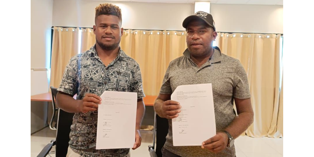 Photo caption: Goshen Enterprise director Livet Maesimae right, with a representative of Besi Youth Association pose with agreement document after their signing on Monday.